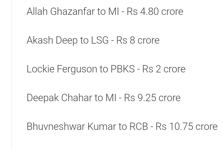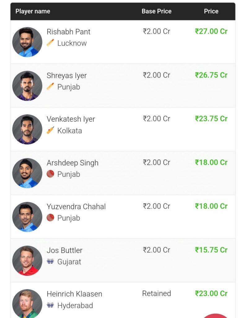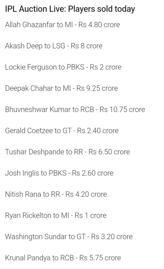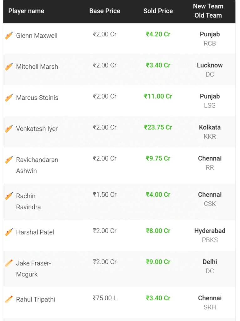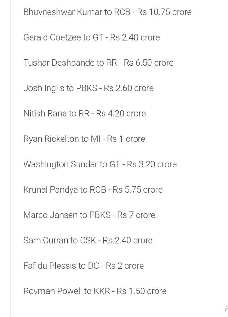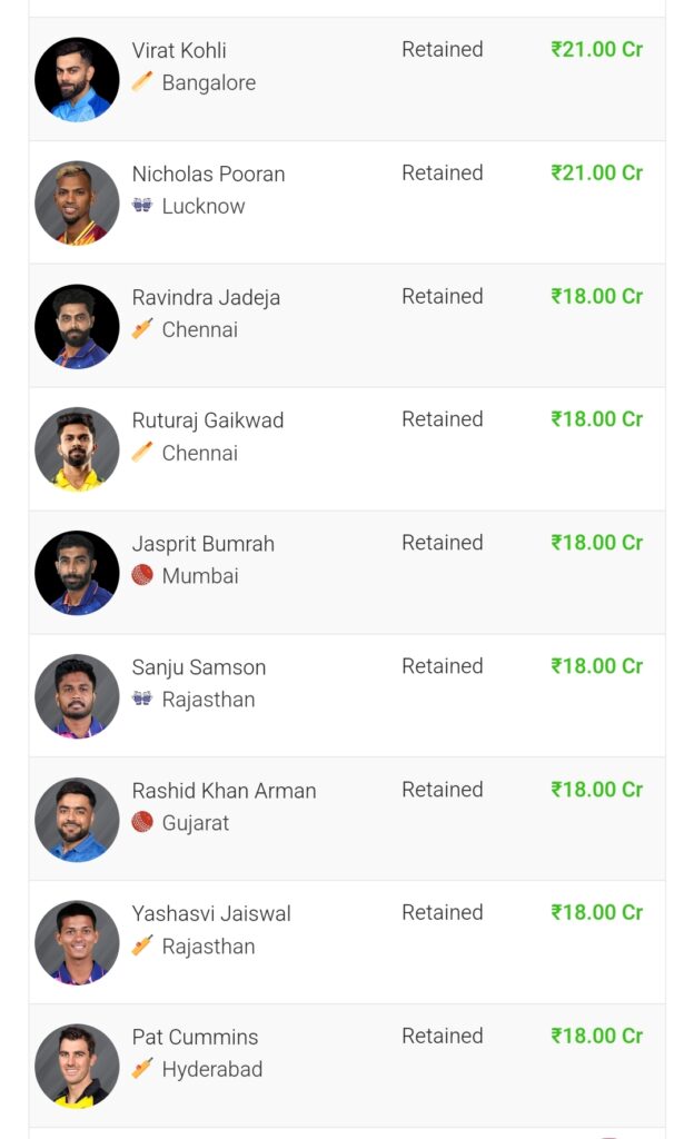 अन्य बड़े नामों में सूर्यकुमार यादव, हार्दिक पांड्या, और जसप्रीत बुमराह शामिल हैं, जिन्हें क्रमशः 16.35 करोड़ और 18 करोड़ में खरीदा गया।