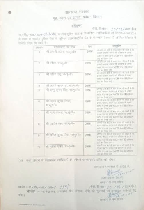 Ranchi: झारखंड के 10 IPS अधिकारियों का प्रमोशन किया गया है। सभी अधिकैरी 2016 बैच के हैं। अन सभी IPS अधिकारियों को जूनियर एडमिनिस्ट्रेटिव ग्रेड के वेतनमान Level-12 of Pay Matrix में प्रमोशन दिया गया है।